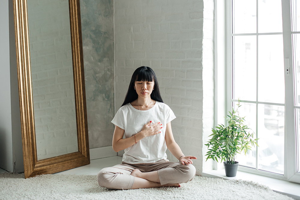- Place your left hand back on your lap, palm facing upwards and take your attention to your whole spinal cord.