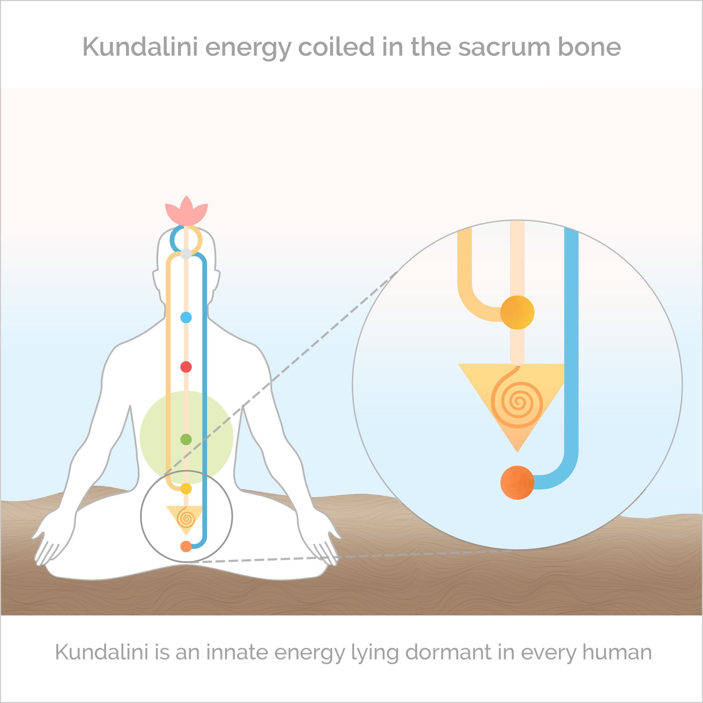 Lying dormant in three and a half coils in our sacrum bone, at the base of the spine, this motherly energy supports and nourishes the various nervous plexuses (places where nerve endings meet) along the spine. Upon awakening (meditation included below), the Kundalini rises and pierces the fontanelle bone area at the top of the head, gently passing through. This awakening is manifested by a cool breeze that emanates from the top of the head. Meditation - i.e. the state of thoughtless awareness - is brought on by this awakening.
